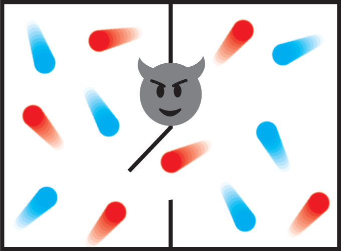 Maxwell concluded that the Second Law itself must possess merely statistical validity, meaning it was true only because it described the most probable of processes. In other words, it was not impossible (though unlikely) that cold could flow to hot. He illustrated his point by inventing a hypothetical little guy (he called it a “being”; Kelvin called it a demon) that could operate a tiny door between two chambers of gas. By allowing only slow molecules to pass one way and fast molecules the other, the demon could make one chamber hotter and the other colder, violating the Second Law.