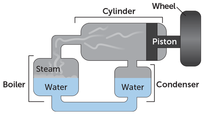 Carnot had studied the steam engine’s use in 18th century England and its role in powering the Industrial Revolution. Steam engines had become the dominant machines in society, with enormous importance for industry and commerce. “They seem destined to produce a great revolution in the civilized world,” Carnot observed. “Already the steam-engine works our mines, impels our ships, excavates our ports and our rivers, forges iron, fashions wood, grinds grain, spins and weaves our cloths….”